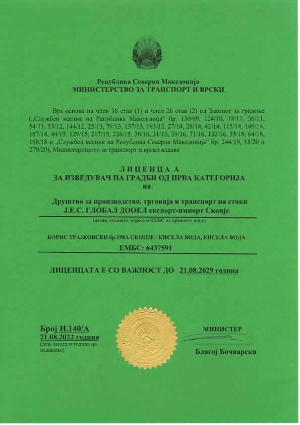 ЛИЦЕНЦА А ЗА ИЗВЕДУВАЧ НА ГРАДБИ ОД ПРВА КАТЕГОРИЈА
