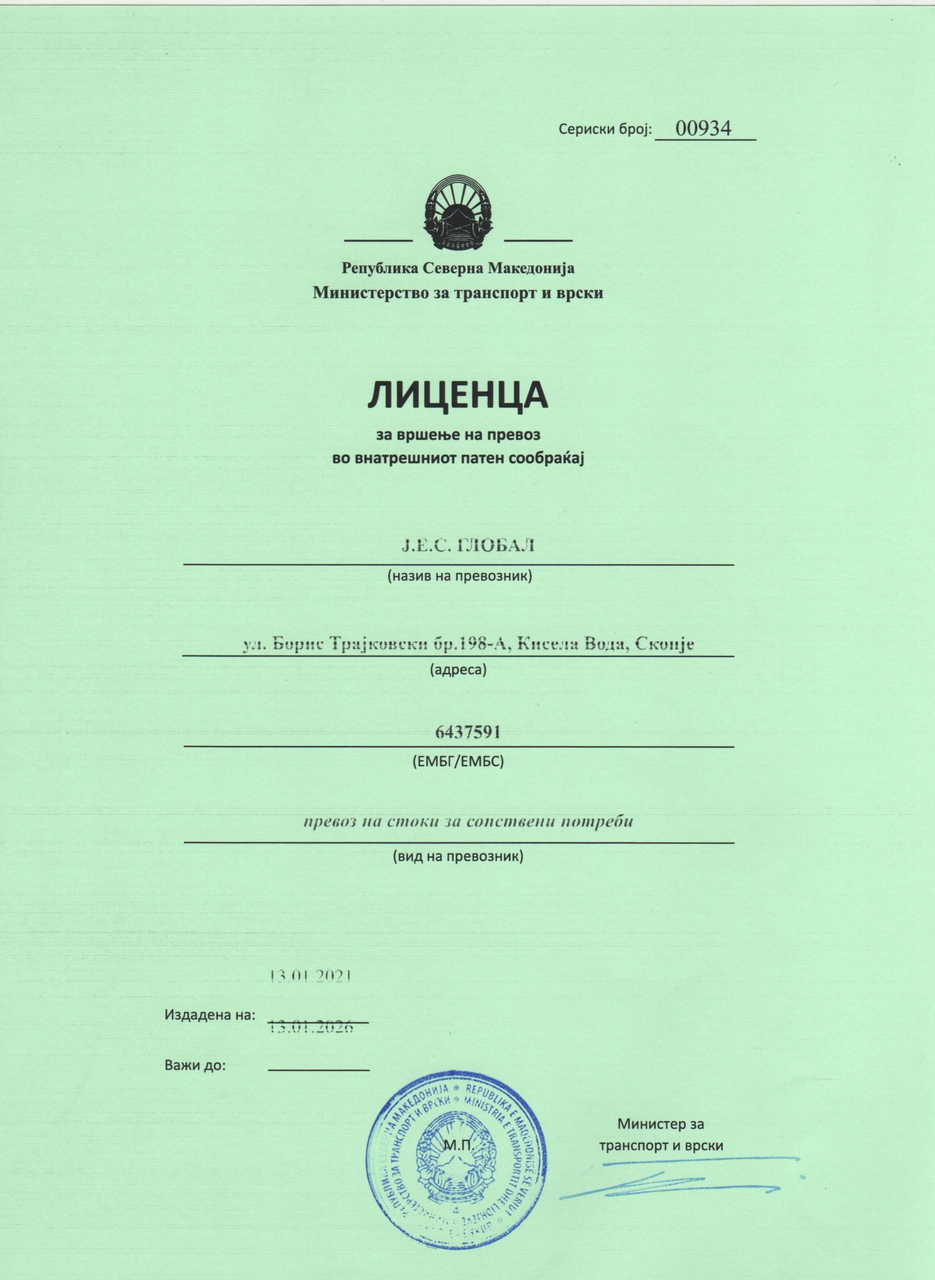 ЛИЦЕНЦА ЗА ПРЕВОЗ НА СТОКИ ЗА СОПСТВЕНИ ПОТРЕБИ