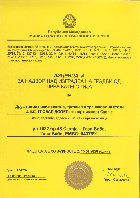 ЛИЦЕНЦА А ЗА НАДЗОР НАД ИЗГРАДБА НА ГРАДБИ ОД ПРВА КАТЕГОРИЈА