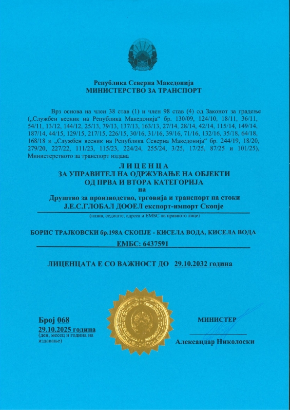 ЛИЦЕНЦА ЗА ОДРЖУВАЊЕ НА ГРАДБИ ОД ПРВА И ВТОРА КАТЕГОРИЈА