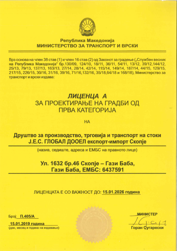 ЛИЦЕНЦА А ЗА ПРОЕКТИРАЊЕ НА ГРАДБИ ОД ПРВА КАТЕГОРИЈА